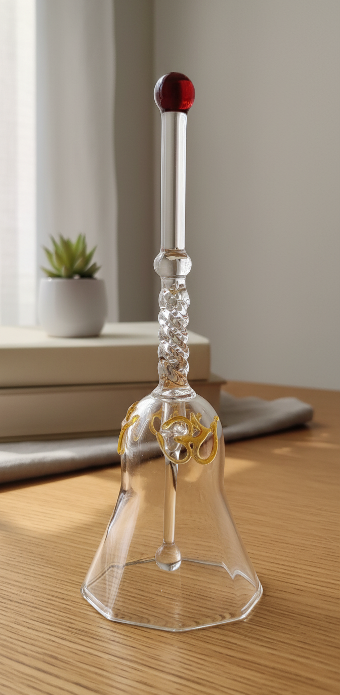 Elevate your sacred rituals and home ambiance with this handcrafted borosilicate glass bell, beautifully designed for puja spaces and stylish interiors. Each bell is made from high-grade borosilicate glass, ensuring exceptional clarity and a premium finish. Its timeless round silhouette and elegant “Om” symbol blend tradition with contemporary design, making it a versatile centrepiece for spiritual, festive, or everyday moments.